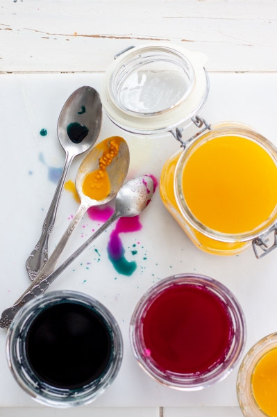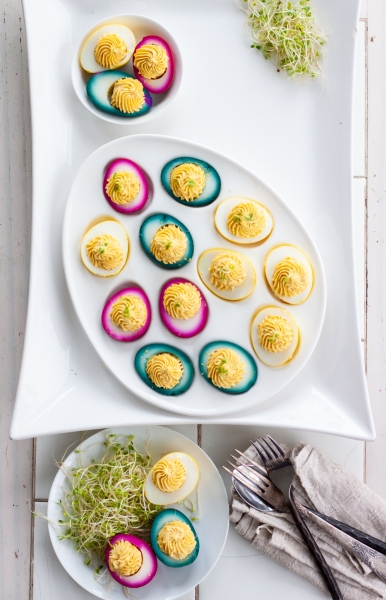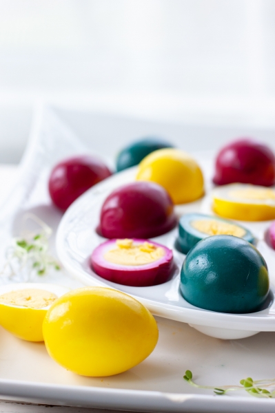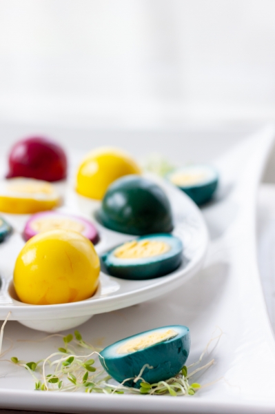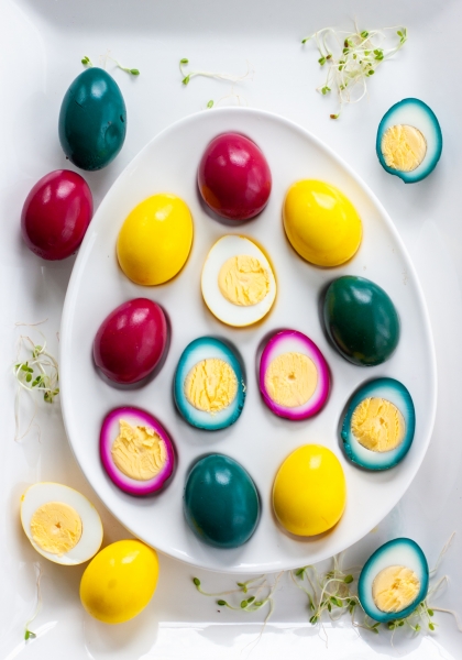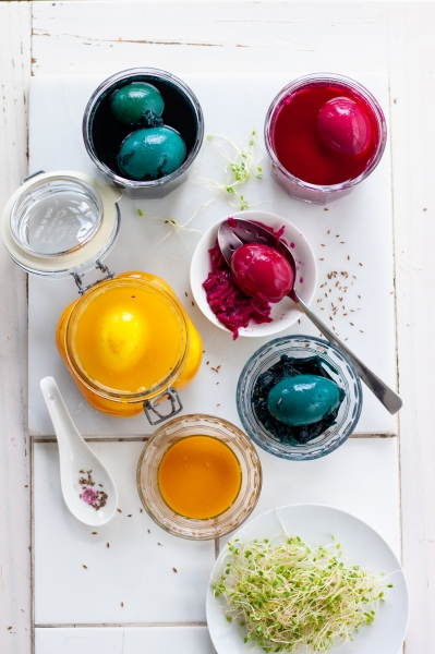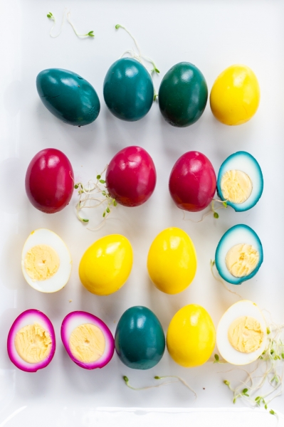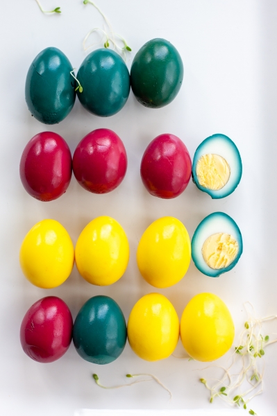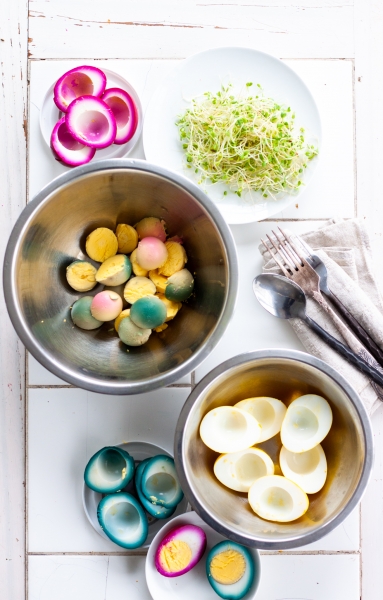 Visos spalvos natūralios ir valgomos: burokėliai, kopūstėliai, ciberžolės milteliai, ir jokios chemijos. Spalvas ir atspalvius galite sukurti kokius tik norite, sumaišant tirpalus norimais santykiais, ir marinuojant kiaušinius ilgiau ar trumpiau.