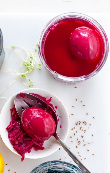 Viską suberti į karštą sūrymą, išmaišyti. Sumerkti nuluptus kietai virtus kiaušinius. Palikti kol atvės. Laikyti šaltai, kol kiaušiniai įgaus norimą atspalvį.