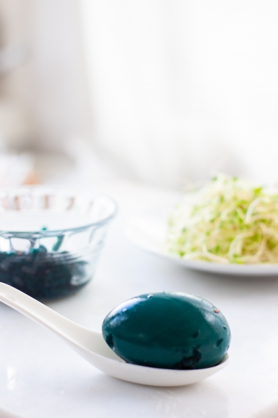Sumaišyti mėlyną ir geltoną tirpalus, norimu santykiu. Sumerkti nuluptus kietai virtus kiaušinius. Palikti kol atvės. Laikyti šaltai, kol kiaušiniai įgaus norimą atspalvį.
