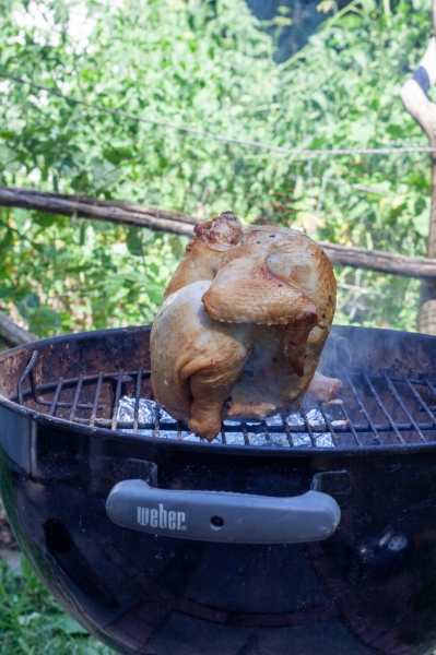Kai grilis gerai įkais, and grotelių stačiai pastatyti viščiuką. Grilį uždengti dangčiu, pilnai atidaryti dangčio angas, kepti 15 minučių.