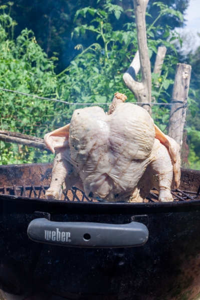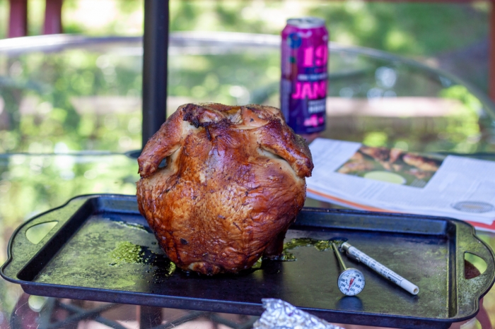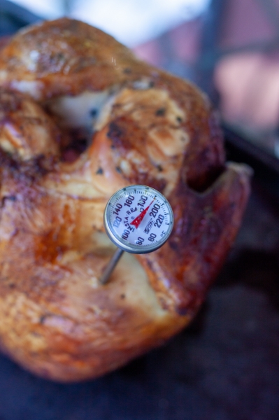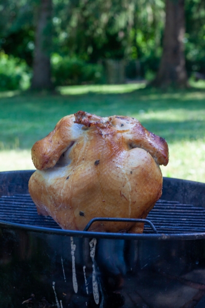 After 15 minutes of cooking, rotate the chicken 90 degrees, cover and cook for another 15 minutes. Continue cooking and rotating every 15 minutes, until the internal temperature of the thickest part of the breast reaches 180-185oF.