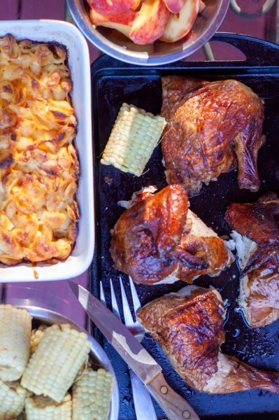 Iškeptą viščiuką perkelti ant pjaustymo lentos, palikti maždaug 10-15 minučių, pjaustyti ir nešti į stalą.