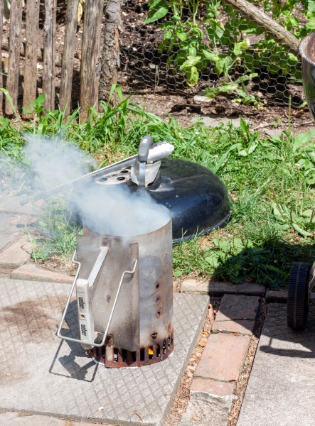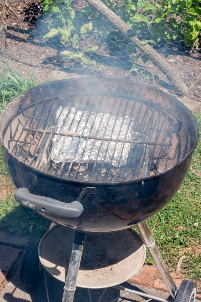 Į anglims skirtą kaminiuką supilti anglis, pripildant maždaug ⅔. Uždegti kaminiuką. Kai anglys įkais, jas supilti į vienkartinį keptuvą, sustumiant link keptuvo galų į dvi vienodo dydžio krūveles. Ant vienos krūvelės dėti paketėlį su skiedromis, įpjovomis į viršų.