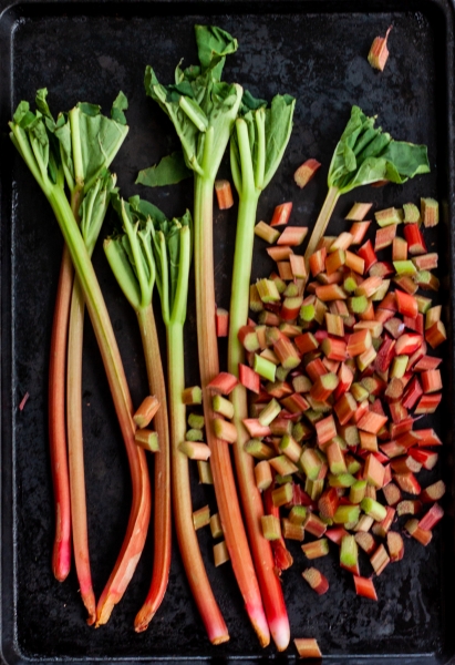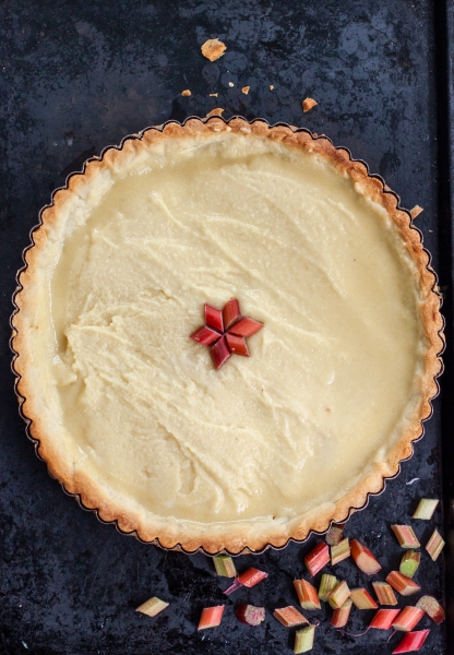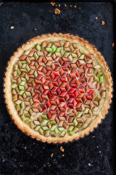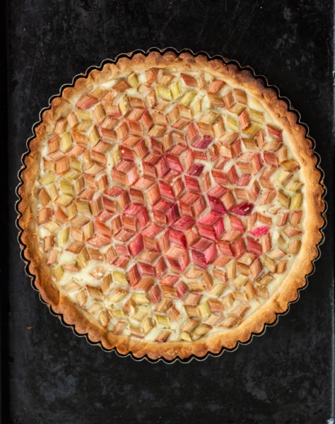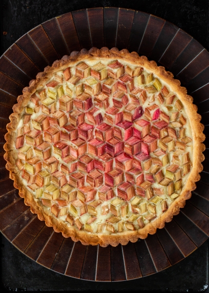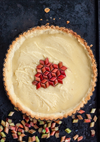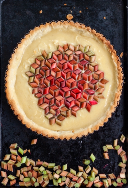 Cut rhubarb into diamond shapes, arrange in decorative pattern.