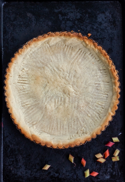 Formą su tešla traukti iš šaldiklio, ant tešlos įtiesti sviestinio popieriaus, iki viršaus priberti sausų pupelių. Formą pašauti į įkaitintą orkaitę, kepti 15 minučių. Traukti iš orkaitės, išpilti pupeles, išimti sviestinį popierių, vėl pašauti į orkaitę, kepti dar 15 minučių. Traukti iš orkaitės, palikti kad pilnai atvėstų.