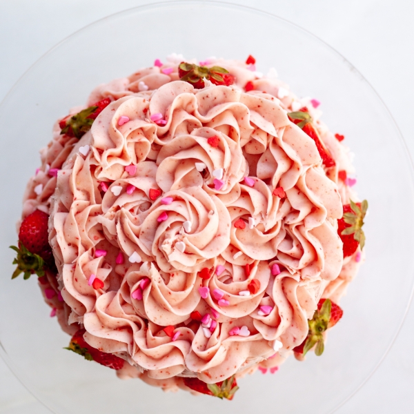 In a food processor, process freeze-dried strawberries into powder. Set aside. Beat cream cheese until completely smooth and creamy. Add butter, beat until combined. Add powdered sugar, strawberry powder, strawberry puree, and salt. Mix until combined. Use right away to frost the cake.