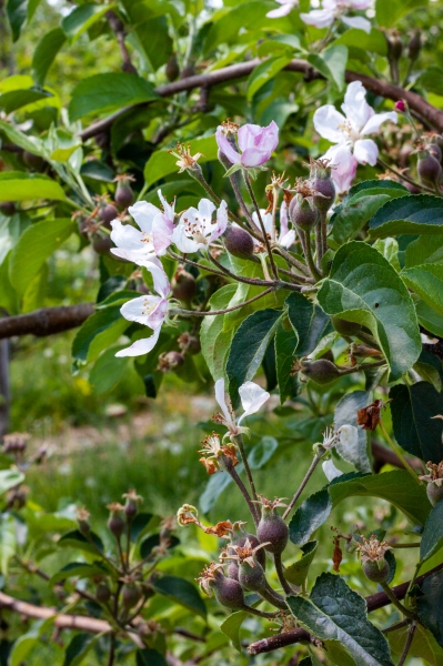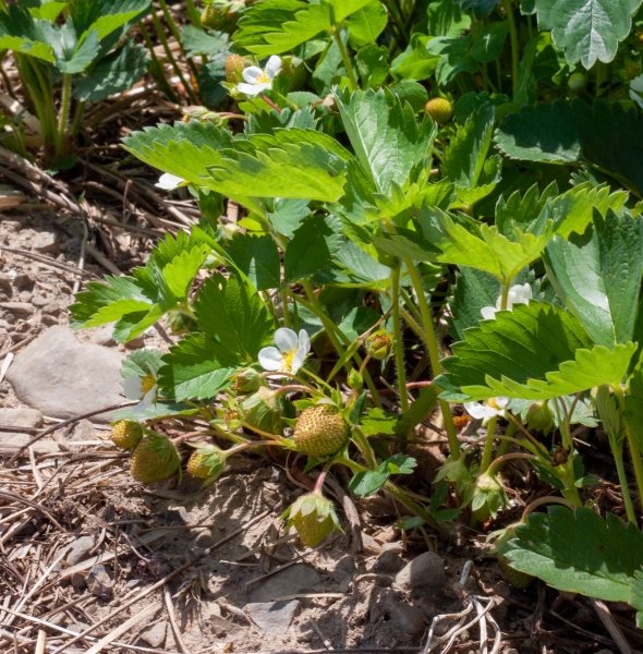 Braškės dar žydi, yra nemažai primegztų, bet dar visiškai žalios, dar savaitė, o gal ir ilgiau, kol pradės raudonuoti.