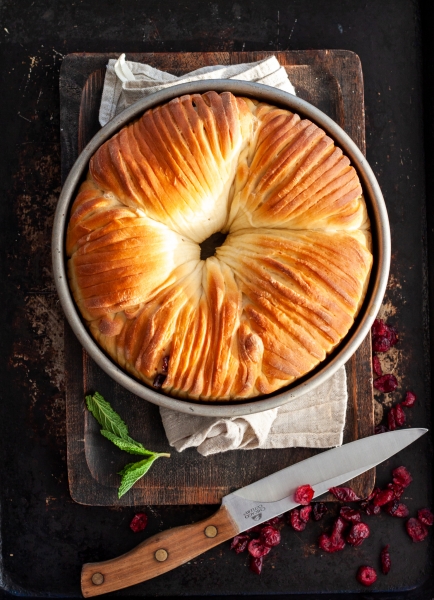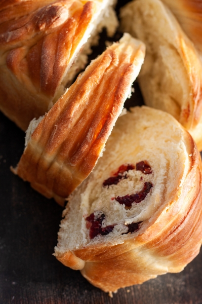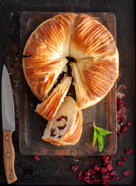 Roll each piece of dough into oval shape, cut one half of the oval into thin strips. Scatter ⅕ of chopped cranberries on the uncut surface of the dough. Starting from the uncut end, roll the dough into a log, place into prepared pan, along the side. Continue with the remaining pieces.