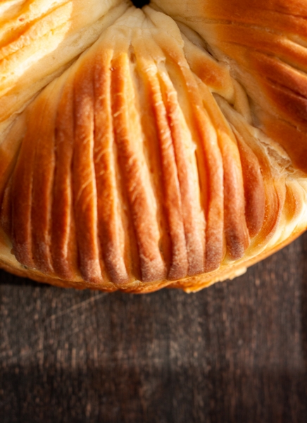 Kekvieną tešlos dalį iškočioti į pailgą ovalo formą, vieną ovalo pusę supjaustyti plonomis juostelėmis. Ant nesupjaustytos tešlos dalies užbarstyti džiovintų spanguolių. Pradedant nuo nesupjaustytos dalies, tešlos ovalą susukti į volelį, dėti į paruoštą formą, išilgai formos krašto. Tokiu pat būdu susukti likusius tešlos gabalėlius.