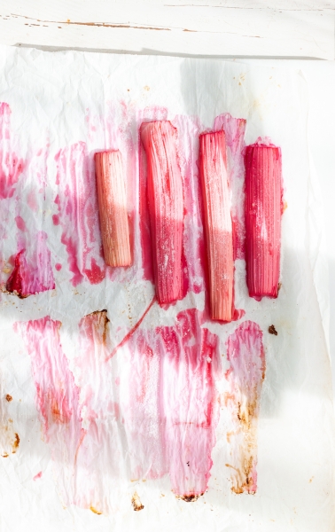 Line a large baking sheet with parchment. Place rhubarb pieces in a single layer onto a prepared baking sheet, sprinkle with sugar. Roast just until tender, about 15 minutes. Remove from the oven, let cool.