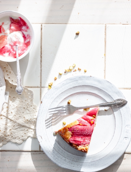 In a food processor, finely grind pistachios. Add flour, baking powder, and salt; pulse to combine. Beat together remaining 8 tablespoons of butter and 1 cup of sugar until light and fluffy. Add eggs, one at a time, beat until incorporated. Add flour mixture in two batches, alternating with yogurt.