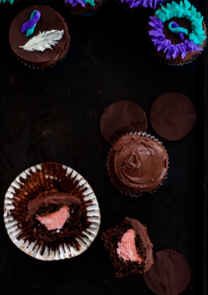 In a large bowl mix flour, cocoa powder, baking powder, baking soda, and In another bowl, whisk eggs, both sugars and oil. Add egg mixture to dry ingredients, in three batches, alternating with buttermilk. Fill cupcake liners halfway, bake for approximately 18-20 minutes. Remove from oven. Let cool completely.
