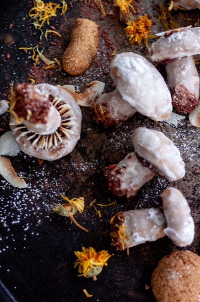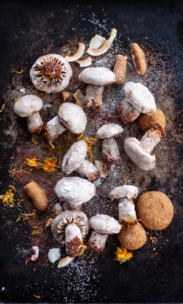 Iš atšalulsios tešlos formuoti grybukus, kepurėles ir kotelius atskirai, dėti ant paruoštos skardos, kepti kol viršus apdžius ir lengvai paruduos. Traukti iš orkaitės.